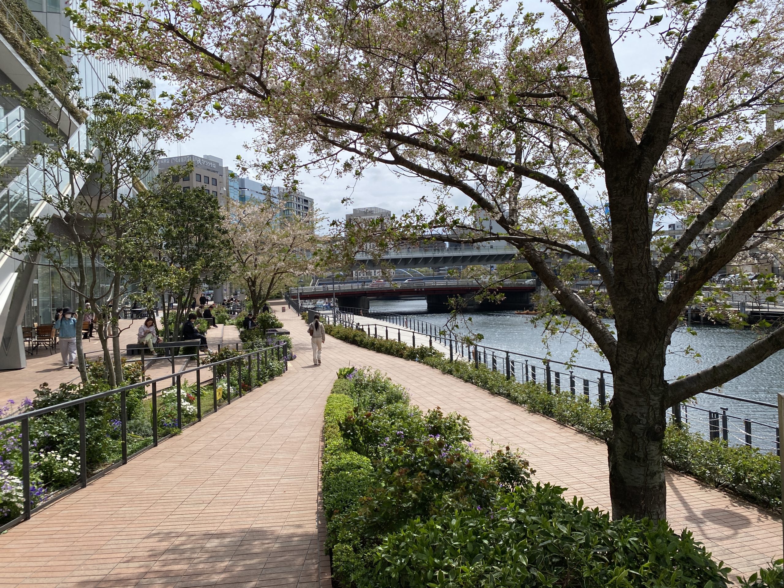 桜越しに見えるレンガ風?の小道と、大岡川の水面が綺麗ですね! 天気も良くて、ゆっくり散歩したくなる風景です♪